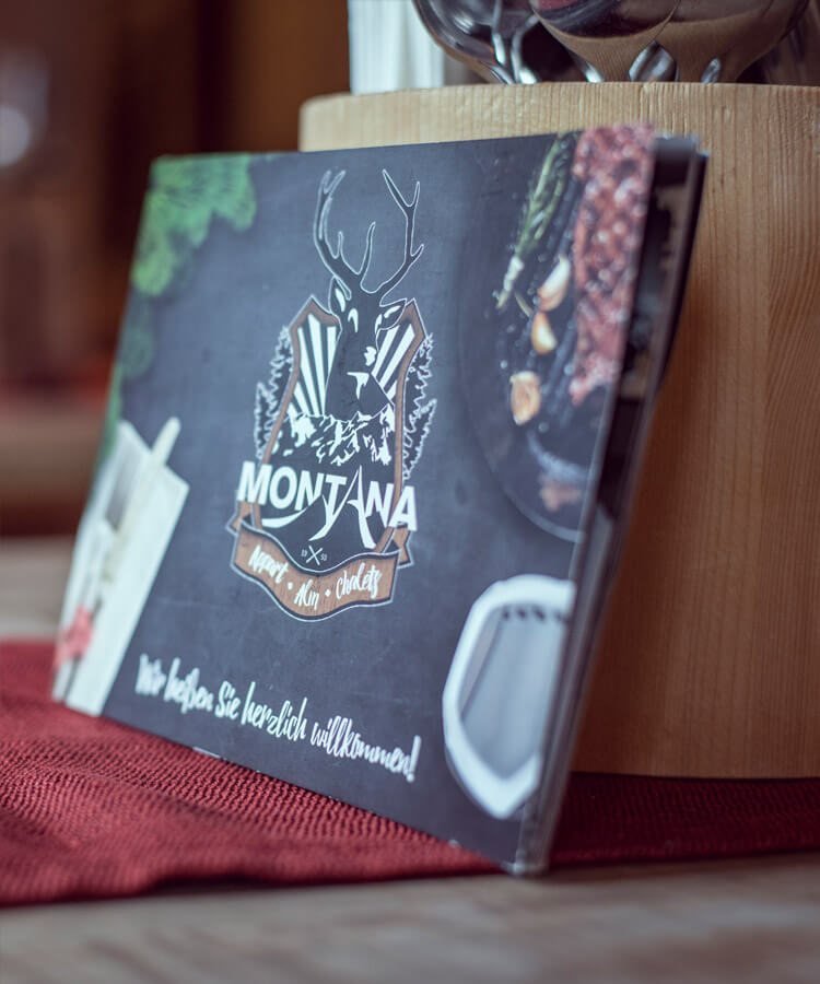 The fire crackles in the open fireplace and fills the lovingly furnished Montana Alm with cozy warmth. Whether in the spacious restaurant or the cozy Stüberl - the rustic old wood and the stylish decoration provide a cozy ambience. The wonderful sun terrace with lounge furniture and chilling music invites you to switch off and enjoy the breathtaking mountain scenery. Guests of the Apparthotel Montana and the Montana Chalets have the option of enjoying their half-board evening menu or an a la carte meal here.