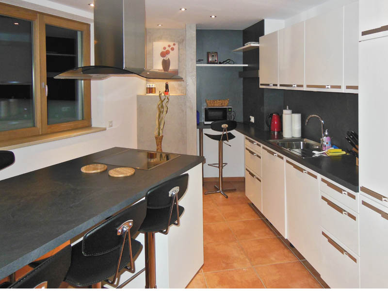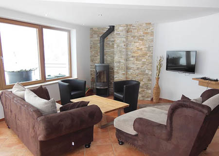 Unser „Penthouse-Apartment” bietet mit 110qm reichlich Platz für 5+ Personen. Von der Lounge im Eingangsbereich führen Steintreppen in das obere Apartment, das direkt am Pistenausgang mit einem privat zugeteilten Skiraum liegt.