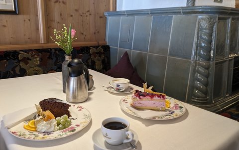 Auch die hausgemachten Kuchen und Torten kann man sich – begleitet von köstlichem Kaffee – schmecken lassen. Zum Beispiel auf der angrenzenden Sonnenterrasse mit imposantem Bergblick-Panorama. Tief durchatmen, entspannt zurücklehnen und sich einfach mal verwöhnen lassen! Oder wie wäre es mal mit selbstgebackenem Brot?