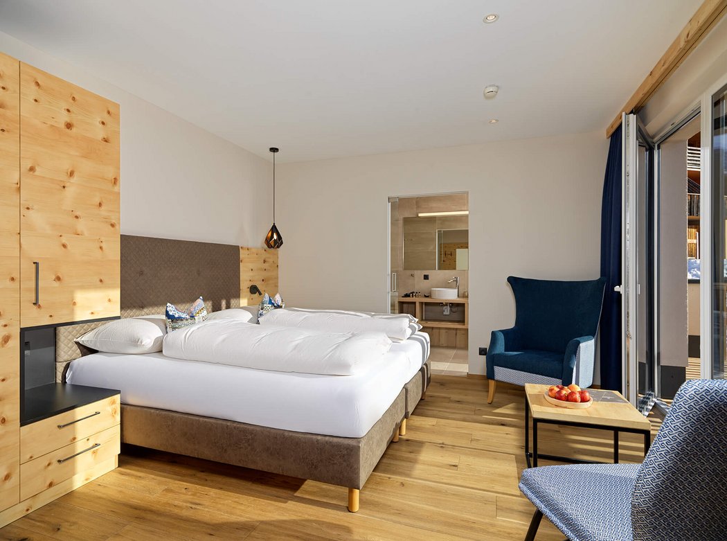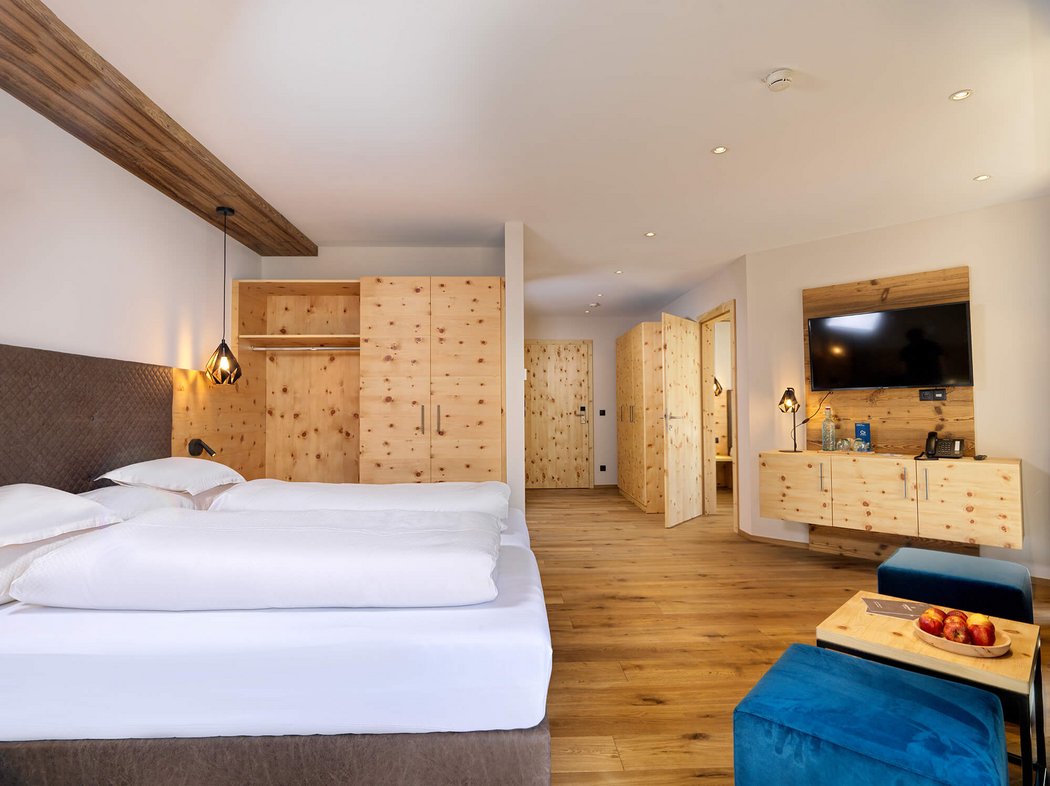 Mit ca. 28 m² bietet unsere Panorama Mountain Junior Suite großzügigen Raum für Ihr Zuhause auf Zeit. Diese neuen Suiten begeistern mit moderner Einrichtung in Zirbe und Altholz, schönen Stoffen sowie perfekt durchdachten Details. Teilweise große Terrasse entlang der ganzen Suite. Wunderschöne Badezimmer – Dusche und WC. Hier lassen sich gemütliche Stunden verbringen und immer mit dem Fokus auf die traumhafte Bergkulisse.